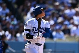 5回一死無走者は1ボールからの2球目、ほぼ真ん中の80・8マイル(約130キロ)のスイーパーをフルスイング。角度12度、打球速度108・8マイル(約175キロ)の弾丸ライナーは右翼線を破る二塁打となった。打球が上がっていれば柵越えだった。