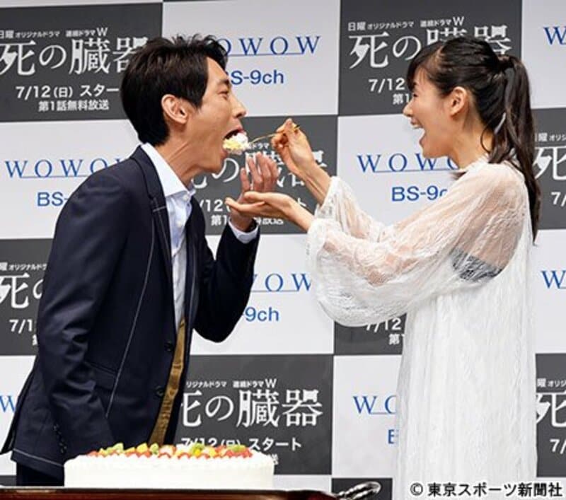 小西真奈美(右)から誕生日ケーキを食べさせてもらう小泉孝太郎
