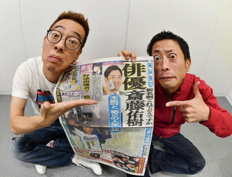 「俳優斎藤佑樹」の1面を手にするロケット団の三浦と倉本(右)
