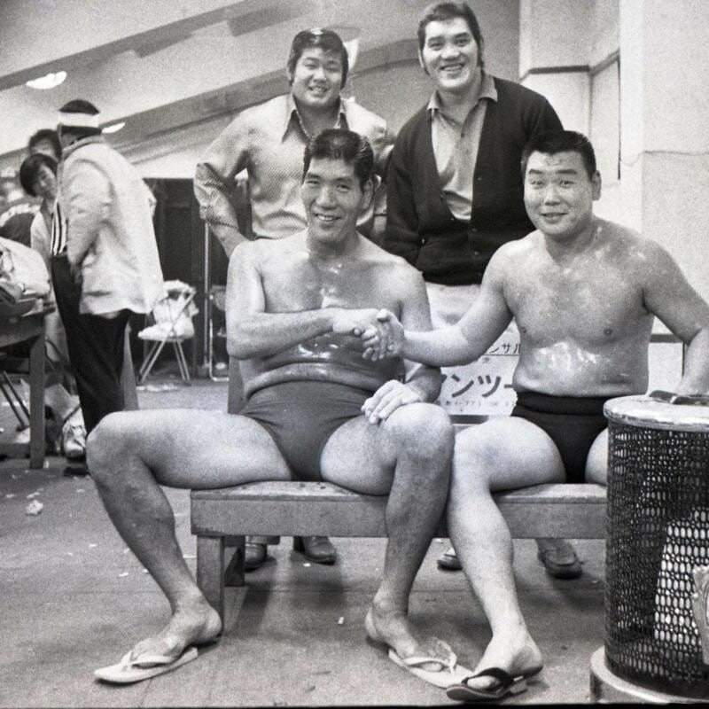 馬場は国際初登場でグレート草津(右)と快勝。後方左からマイティ井上、ストロング小林
