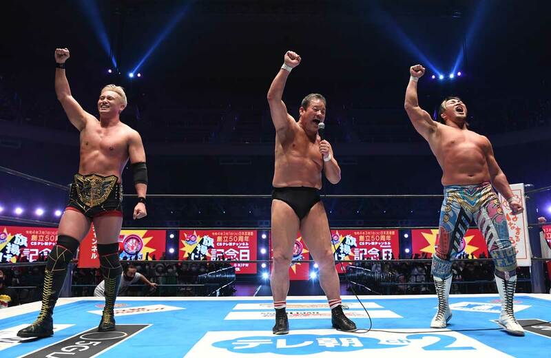 アントニオ猪木氏に「1、2、3、ダーッ!」のエールを送った(左から)オカダ、藤波、棚橋(東スポWeb)