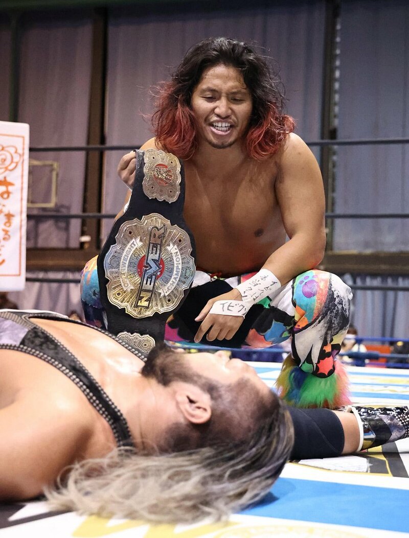 NEVERのベルトを手に、王者EVIL(下)を挑発するヒロム