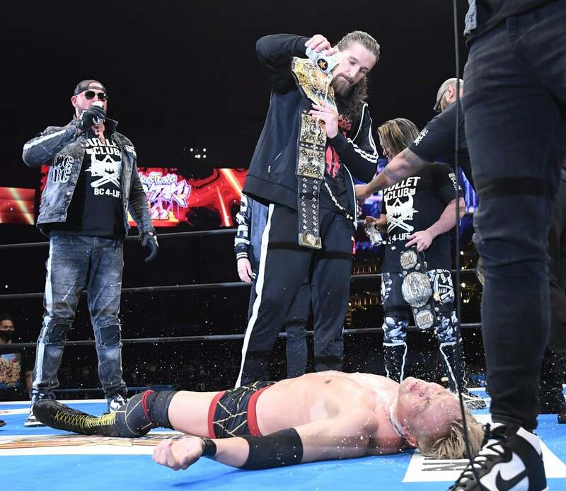 試合後乱入したジェイ・ホワイトにビールをかけられるオカダ(東スポWeb)