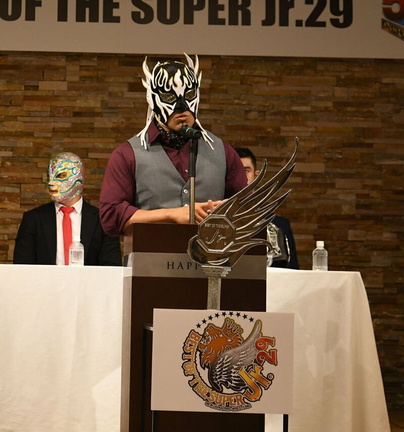 会見に出席したエル・デスペラード(新日本プロレス提供)