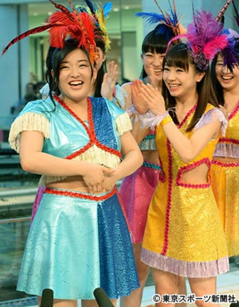 スカートのウエスト部分に指を入れ、隙間があることをアピールする鈴木香音。左はそれを見て爆笑する石田亜佑美