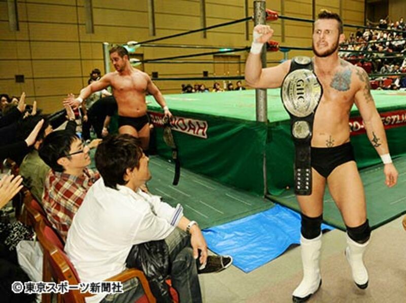 GHCタッグのベルトを肩に引き揚げるヘイスト(右)とニコルス