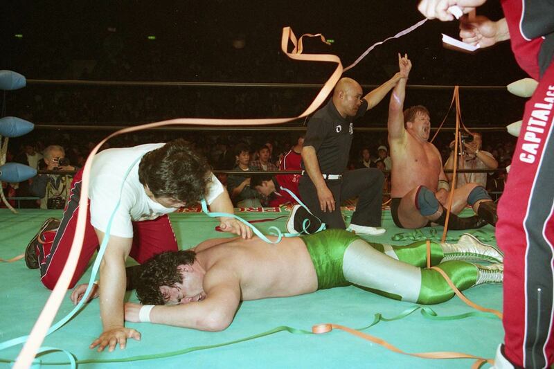 豪快なパワーボムでダウンした三沢。精魂尽き果てた不沈艦も座ったままで勝ち名乗りを受けた