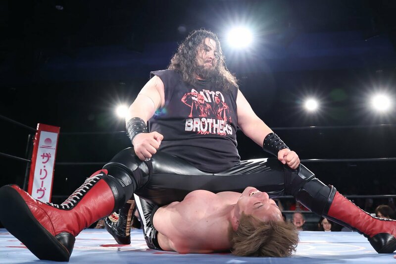 潮崎豪(下)をヒップドロップで押しつぶした斉藤レイ