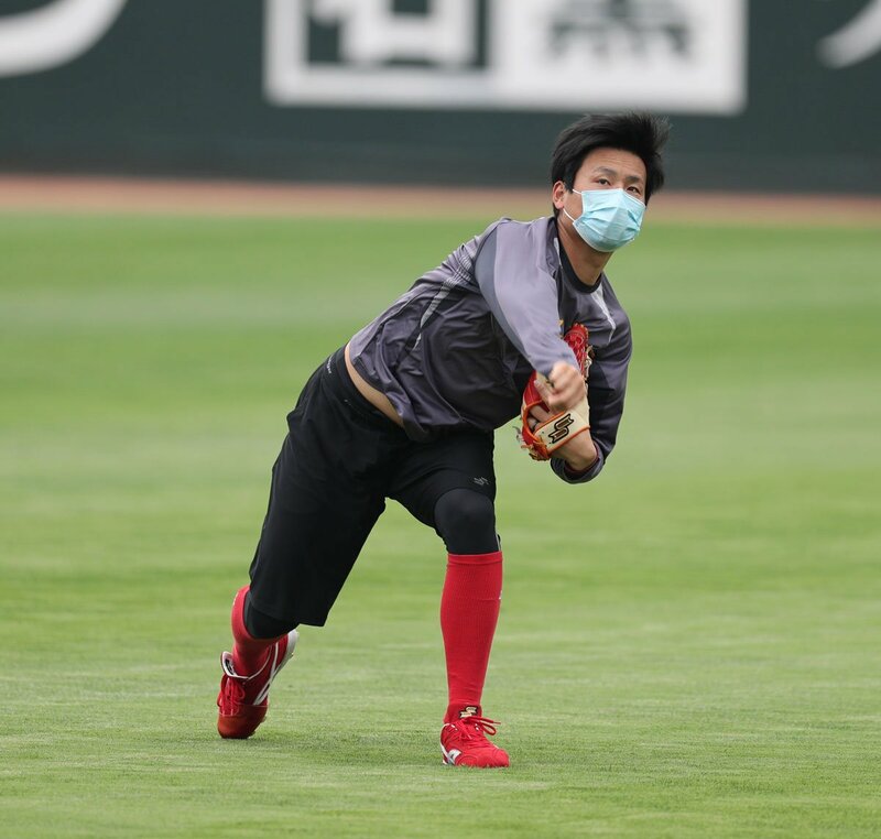 マスクをつけて練習する広島・栗林(球団提供)