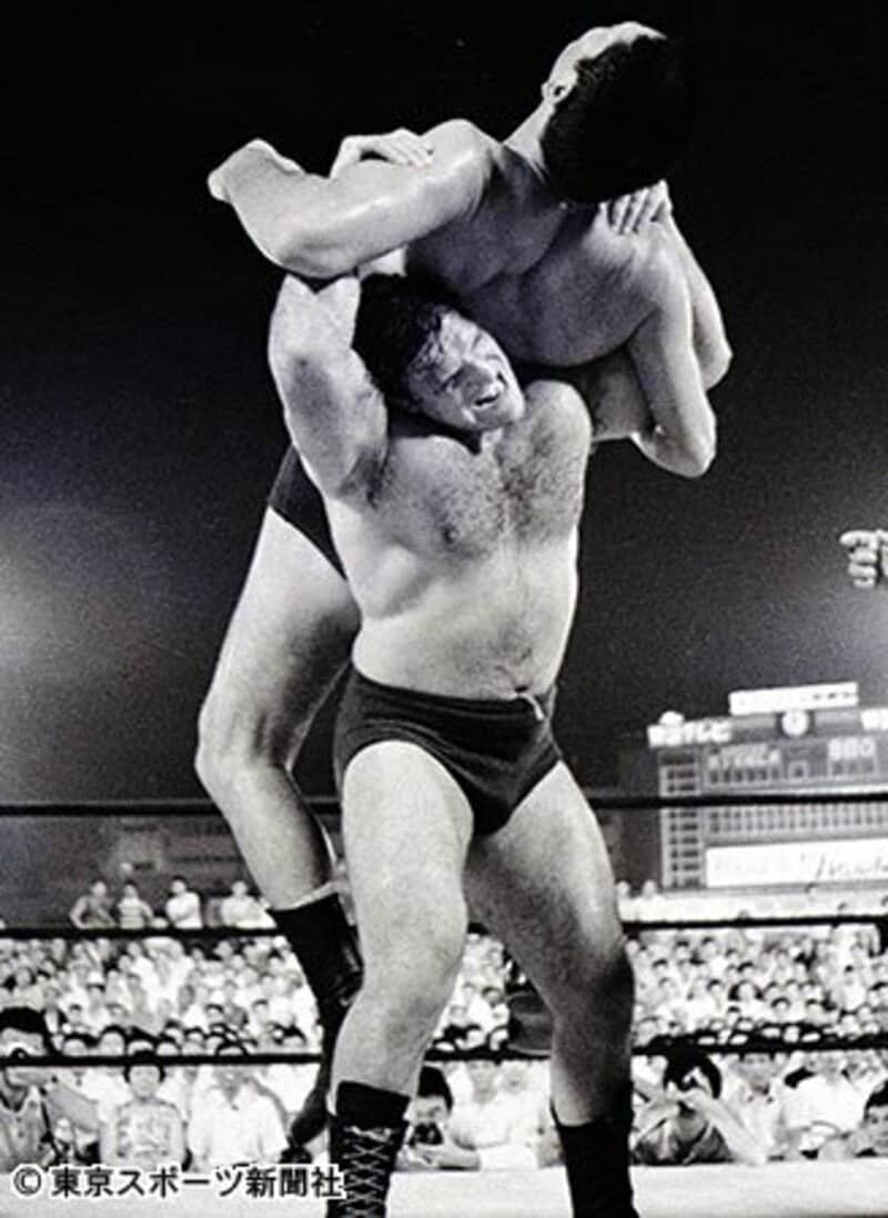 故ジャイアント馬場さん(上)を得意技のカナディアン・バックブリーカーで担ぎ上げるサンマルチノ氏。馬場さんとは幾多の名勝負を繰り広げた(1968年8月、大阪球場特設リング)